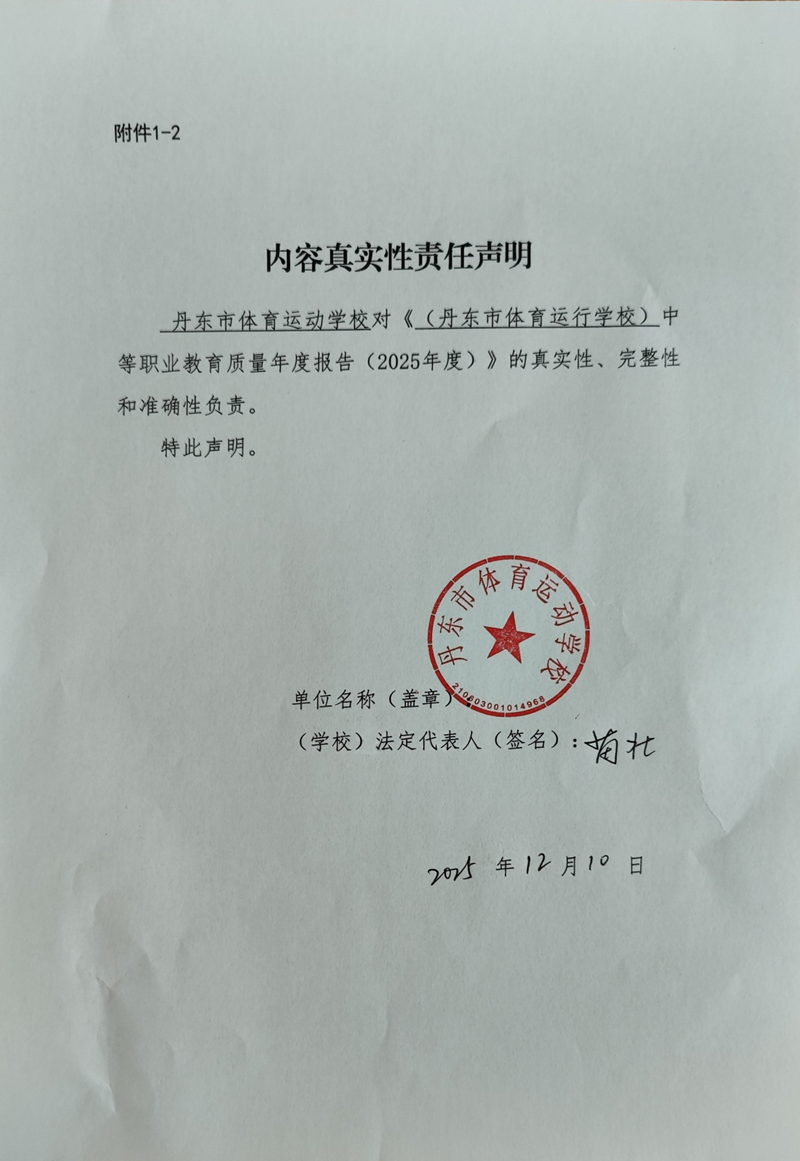 《(丹东市体育运动学校)中等职业教育质量年度报告(2025年度)》内容真实性责任声明